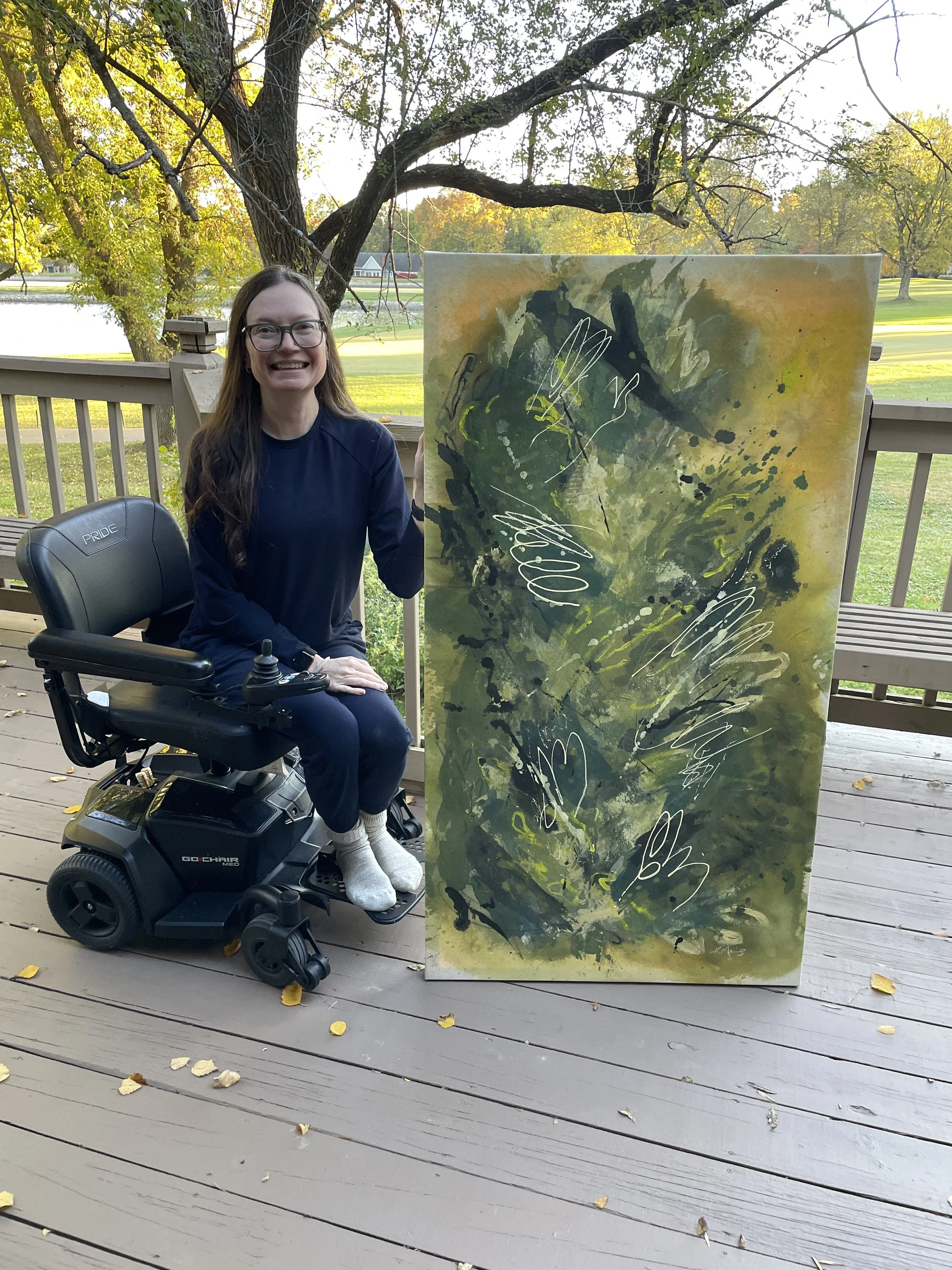 Kelly Meiners, PhD, is a disabled artist based in Kansas City, MO. Her abstract art captures her resilient, evolving artistic voice using intuitive painting as both communication and healing, revealing a layered portrait of grief, adaption, and hope.